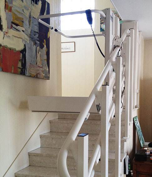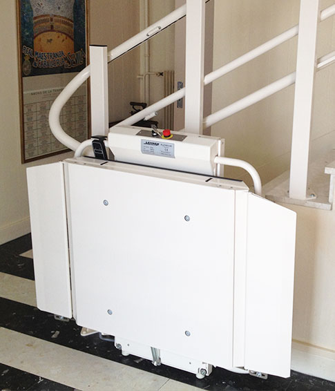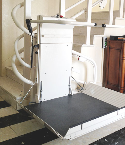 La plateforme glisse le long d’un rail sur mesure fixé sur les marches ou sur le mur latéral s’il existe.